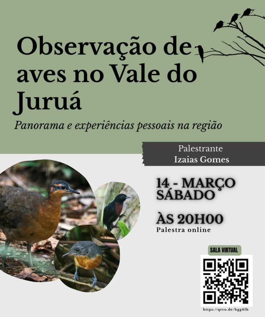 Compartilhar a experiência de iniciação, a trajetória na observação de aves e dicas práticas para a atividade no Vale do Juruá, interior do Acre: este é o objetivo de Izaias Gomes, jovem condutor e membro do Grupo de Observação de Aves do Vale do Juruá. A organização realiza um evento gratuito neste sábado, 14, de forma online, pelo link: https://qrco.de/bgg4Ih. O encontro é aberto ao público interessado em conhecer mais sobre a atividade na região.