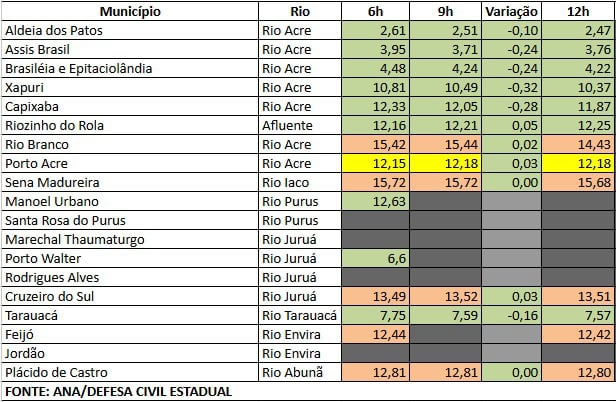 Já em Porto Acre, o Rio Acre registra 12,18m e segue em estabilidade, sem alterações em relação à última medição. Em Sena Madureira, o Rio Iaco permanece com 15,68m, também sem variação registrada. Situação semelhante é observada em Feijó, onde o rio Envira marca 12,42m e continua estável, sem apresentar elevação ou recuo no nível das águas.