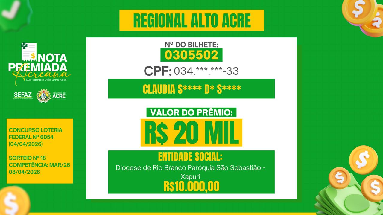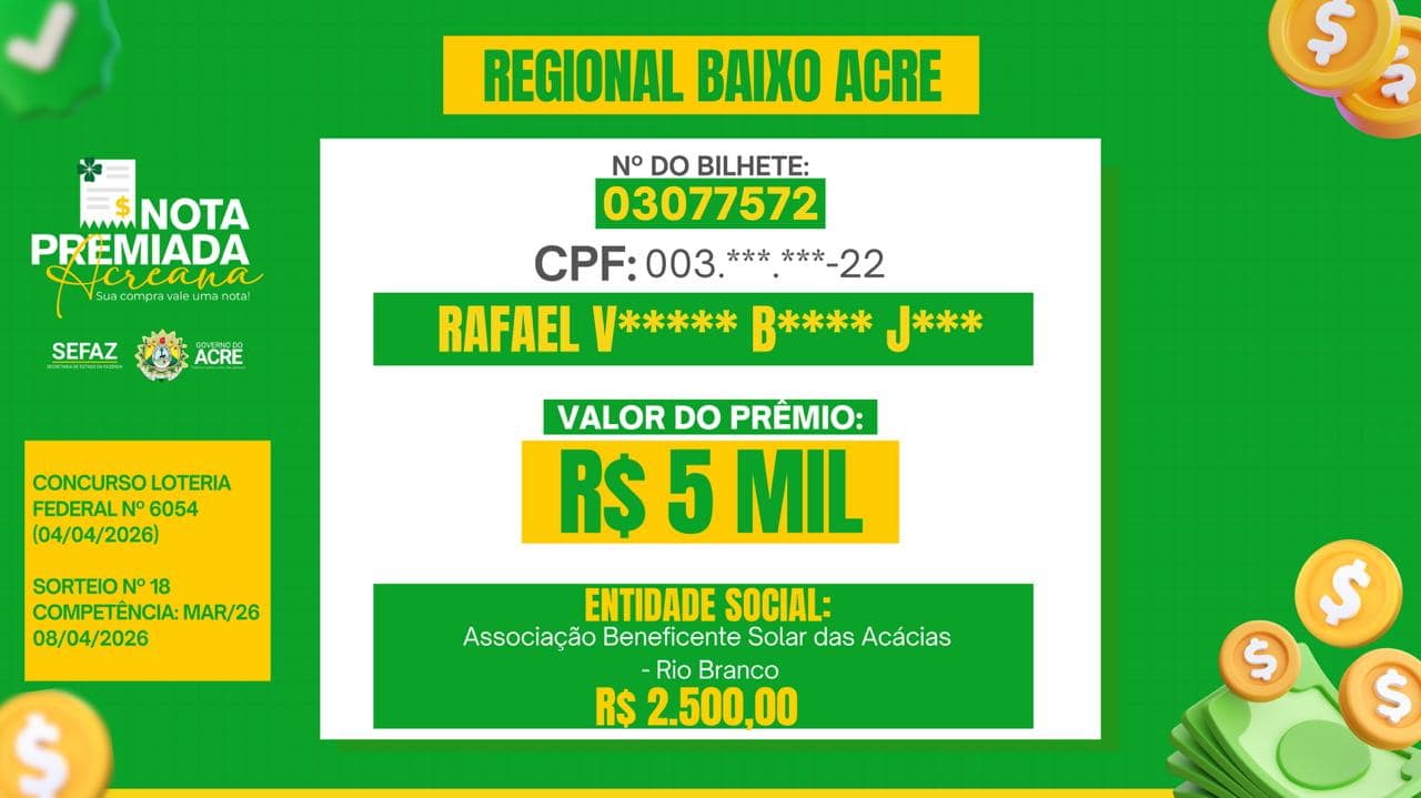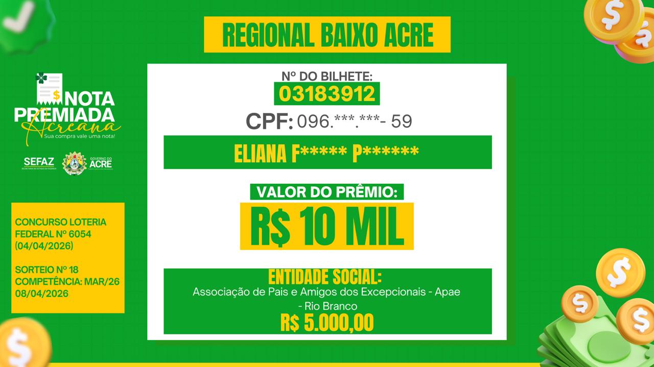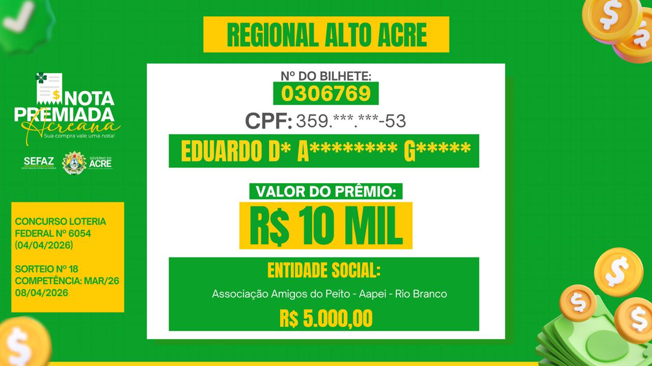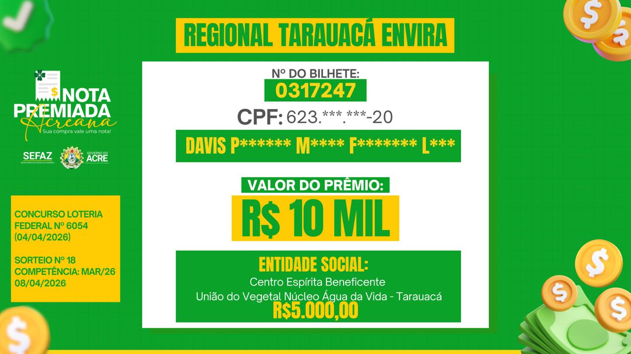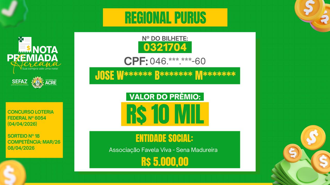 Contemplado duas vezes pelo programa, nas premiações de R$ 20 mil e, posteriormente, R$ 5 mil, ele destaca os impactos positivos do programa Nota Premiada Acreana, que teve a divulgação dos ganhadores do mês de março realizada nesta quarta-feira, 8.