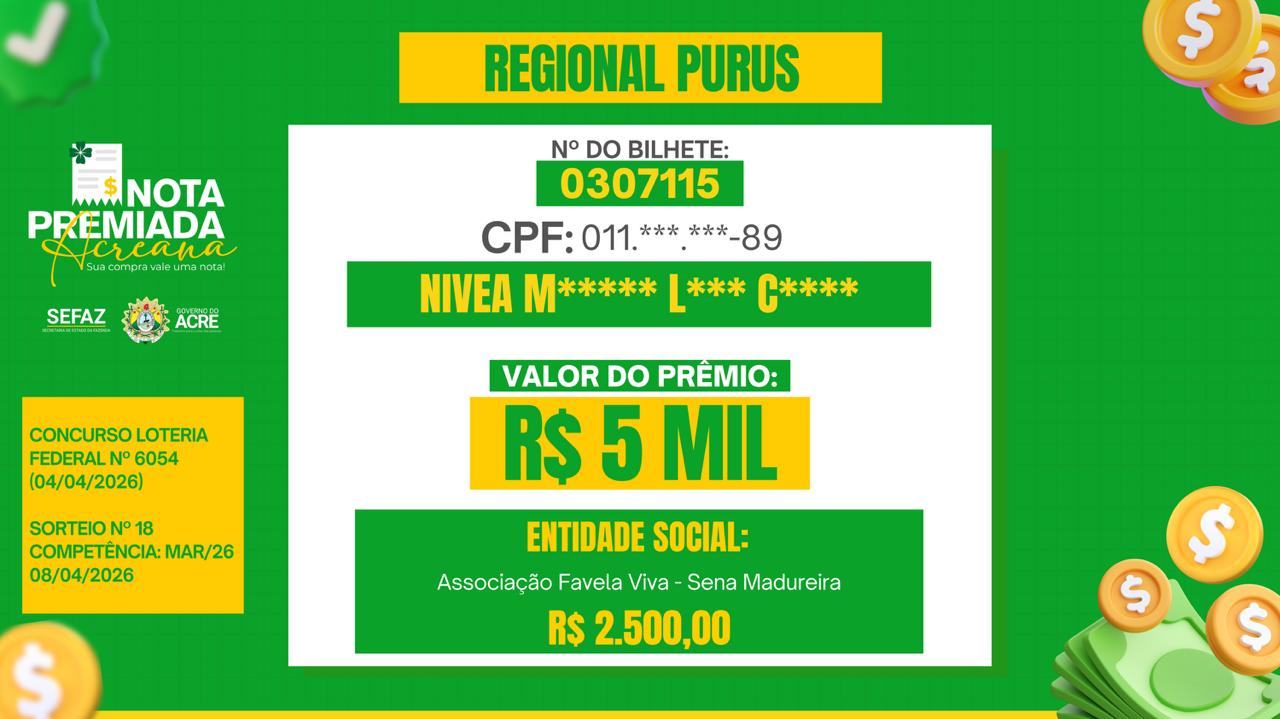 O Nota Premiada Acreana incentiva os cidadãos a incluírem o CPF na nota fiscal no momento das compras, garantindo a participação em sorteios mensais com de R$ 5 mil, 10 mil e 20 mil, além de contribuir com entidades sociais escolhidas pelos próprios participantes.