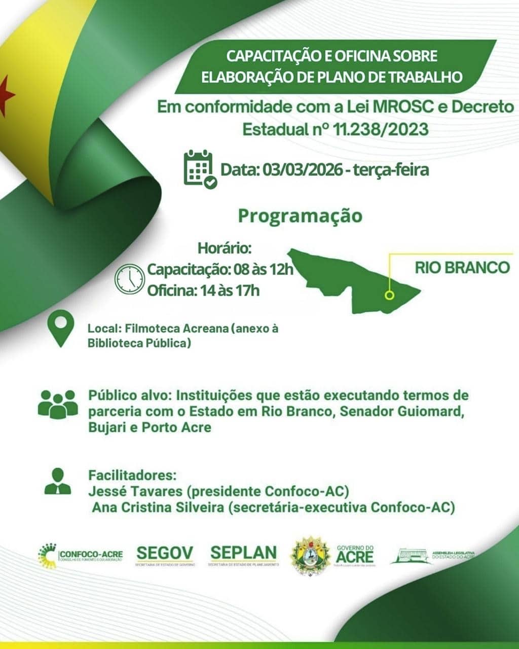 Com o objetivo de qualificar a gestão de parcerias entre o Estado e as Organizações da Sociedade Civil (OSCs), o governo do Acre, por meio do Conselho de Fomento e Colaboração (Confoco-AC), realiza nesta terça-feira, 3, a capacitação e oficina sobre elaboração de plano de trabalho.