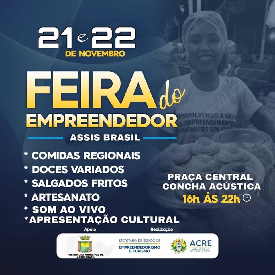 Como parte do curso “Desenvolvendo a Gestão de Empreendimentos Econômicos Solidários”, a Secretaria de Estado de Empreendedorismo e Turismo (Seet), em parceria com a Prefeitura Municipal de Assis Brasil, realiza a Feira do Empreendedor, dias 21 e 22, das 16h às 22h, na Concha Acústica da Praça Central do município.