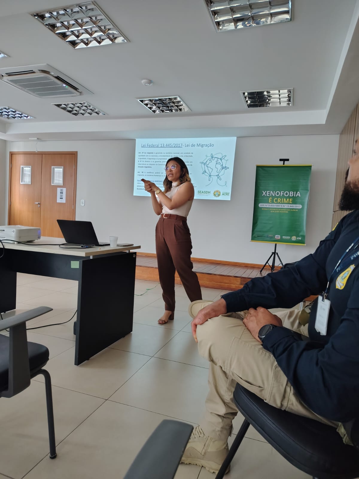 A Secretaria de Estado de Assistência Social e Direitos Humanos (SEASDH), em parceria com a Organização Internacional para as Migrações (OIM), realizou nesta terça-feira, 7, uma capacitação no auditório da Secretaria de Estado de Administração (Sead), em Rio Branco, voltada aos novos agentes da Polícia Rodoviária Federal (PRF). A ação teve como foco o enfrentamento ao tráfico de pessoas, ao contrabando de migrantes e à erradicação do trabalho análogo à escravidão.