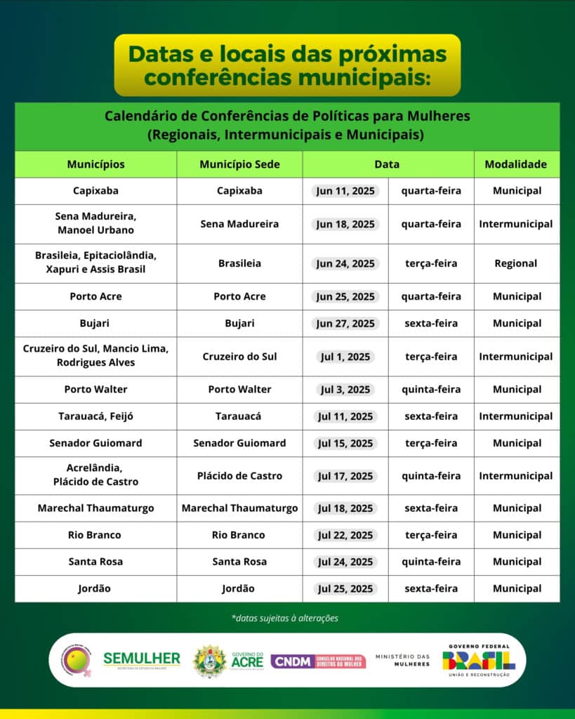 As etapas municipais da 5ª Conferência Estadual de Políticas para as Mulheres iniciam na próxima quarta-feira, 11, em Capixaba. A 5ª Conferência, prevista para agosto, foi anunciada oficialmente em abril, por meio da Secretaria de Estado da Mulher (Semulher), no Diário Oficial do Estado.