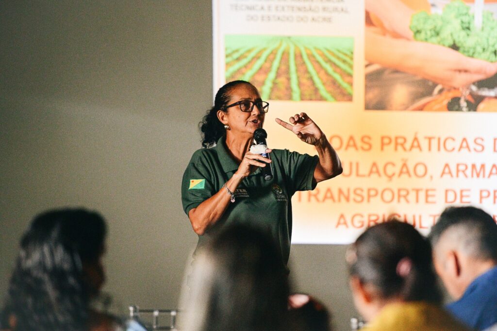 O encontro, realizado no auditório da Indústria, no Parque de Exposições Wildy Viana, reuniu produtores rurais para orientações técnicas voltadas ao fornecimento adequado de alimentos para o Programa de Aquisição de Alimentos (PAA) e o Programa Nacional de Alimentação Escolar (PNAE), que abastecem escolas e universidades com produtos oriundos da agricultura familiar.