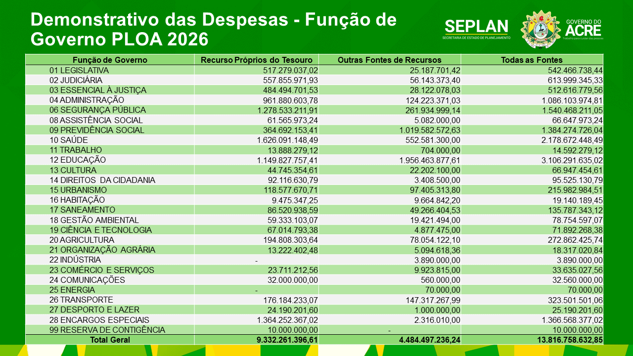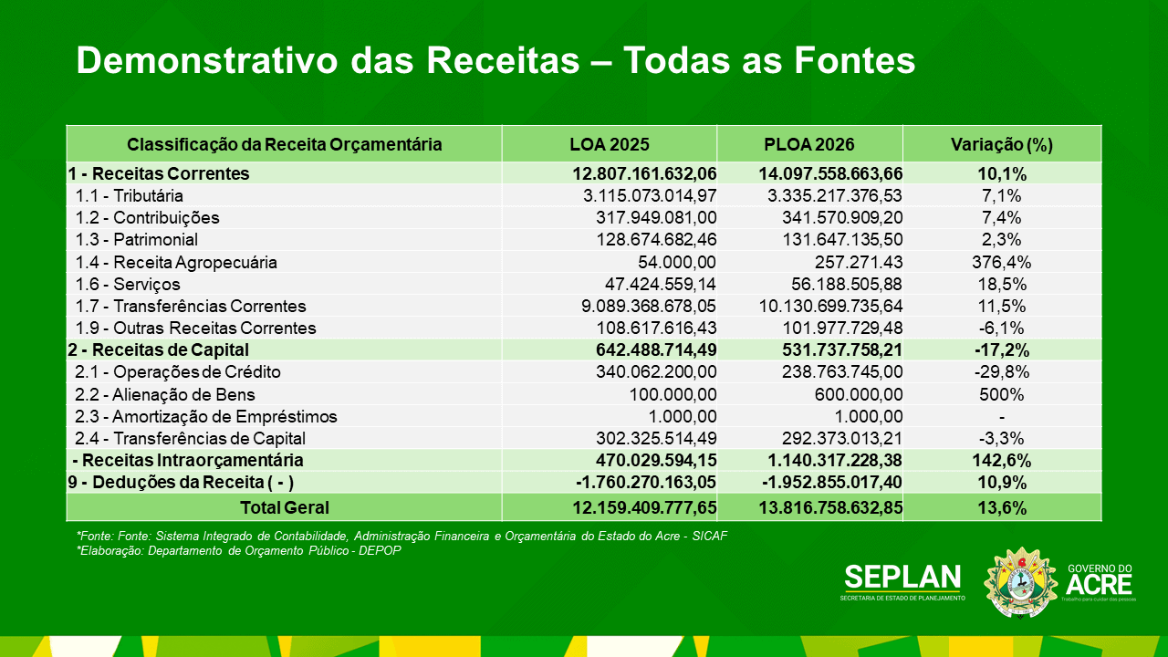 Os números projetados para o exercício de 2026 tiveram um aumento de 13,63%, comparados com os de 2025, somando mais de R$ 13,8 bilhões, sendo estes R$ 9,3 bilhões em recursos próprios e R$ 4,4 bilhões provenientes das demais fontes de recursos, em conformidade com as leis e normas que disciplinam a matéria orçamentária.