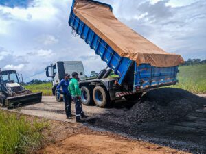 As equipes aplicam massa asfáltica nos pontos onde o pavimento apresentou buracos e desgaste, principalmente após as chuvas. O objetivo é evitar que o problema aumente e garantir condições seguras de tráfego.
